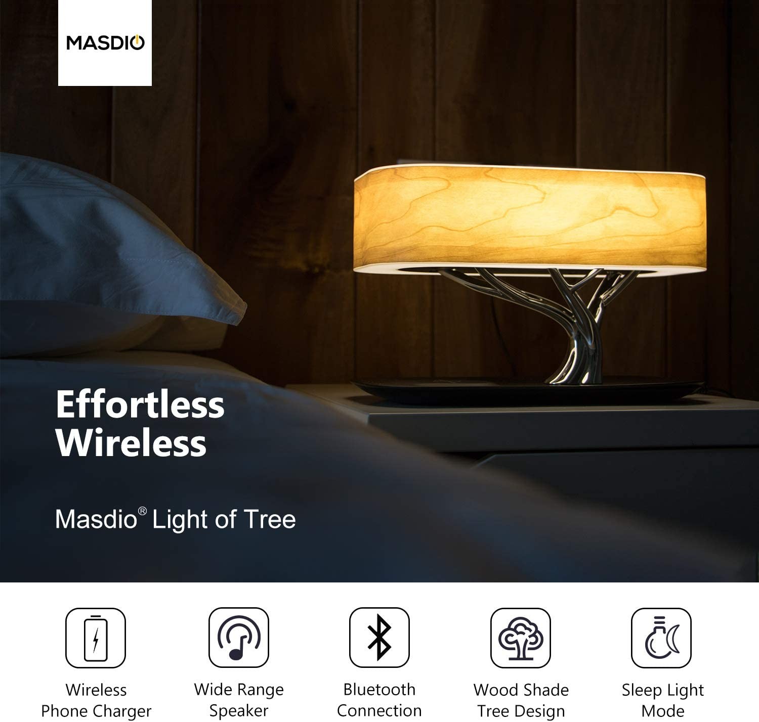 AMPULLA Masdio by Ampulla Bedside Lamp with Bluetooth Speaker and Wireless Charger, Desk Lamp with Sleep Mode, Stepless Dimming
