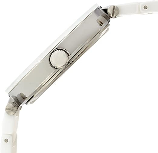 The white dial is enhanced by rose gold-tone hands. Siver-tone metal case, white ceramic and stainless steel strap. Quartz movement. Water resistant to 30 meters/100 feet. Fixed bezel. Scratch resistant mineral crystal. Solid caseback. Jewelry clasp pull/push crown. Case dimensions 33mm x 8mm. Strap 16mm x length. Anne Klein 1019WTWT watch.