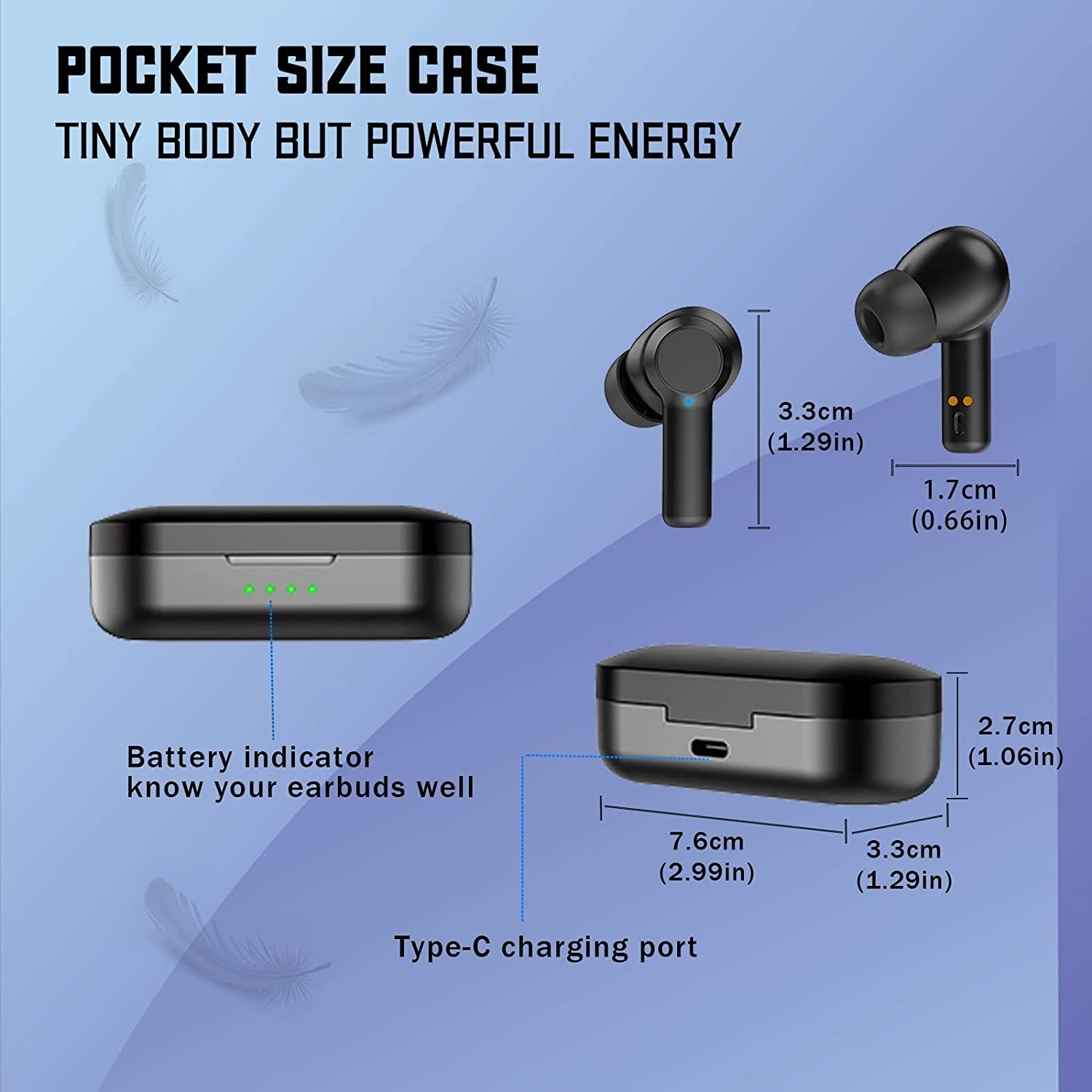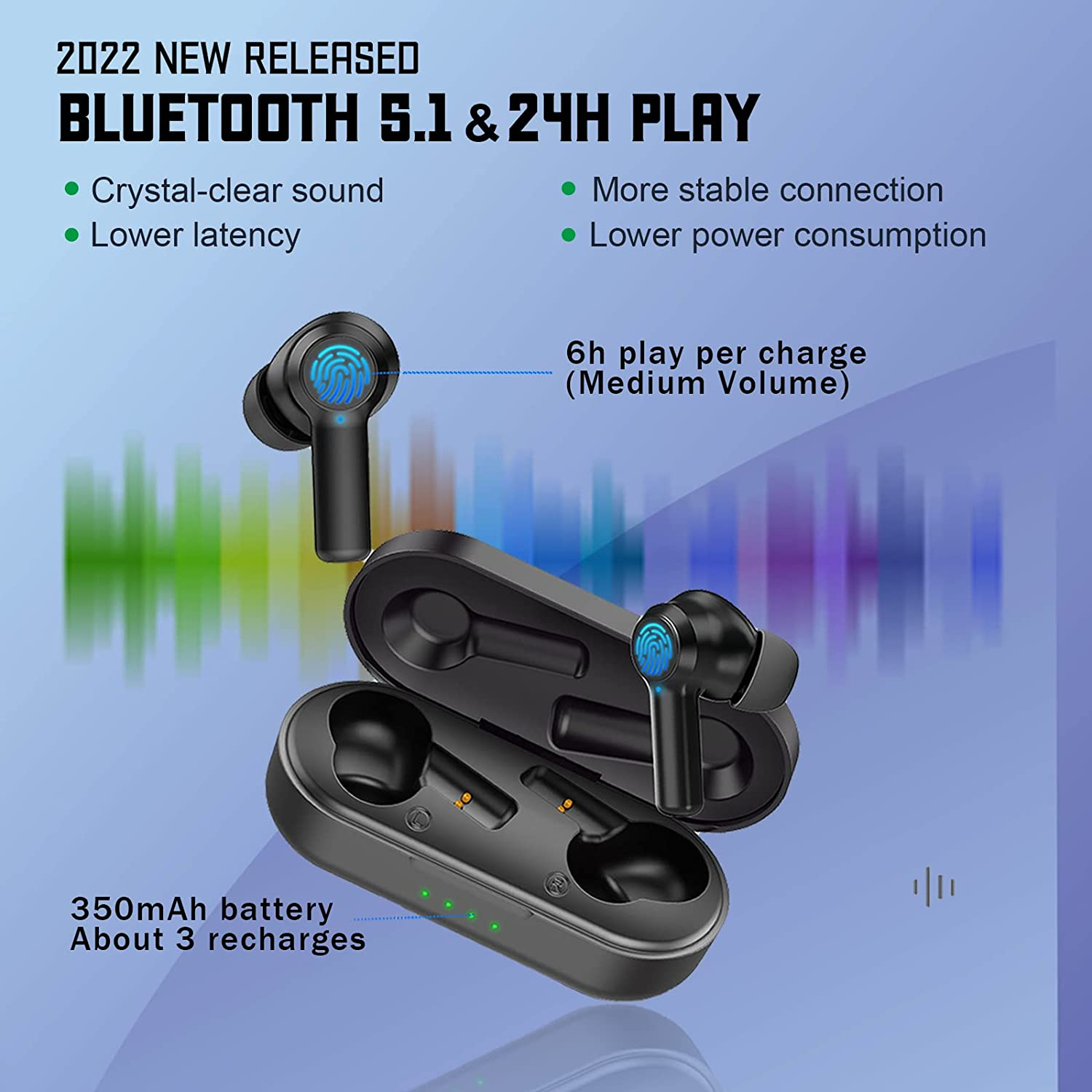 All-day Long Playing: With large capacity battery and lower power consumption chip, the Bluetooth wireless ear buds can play about 6H (medium volume) per charge and with charging case, it can play up to 24H totally (the charging case can charge up the earbuds about 3 times). Using type-c fast charging, it takes about 1 hour to fully charge. The indicator on charging case will tell the power level clearly.